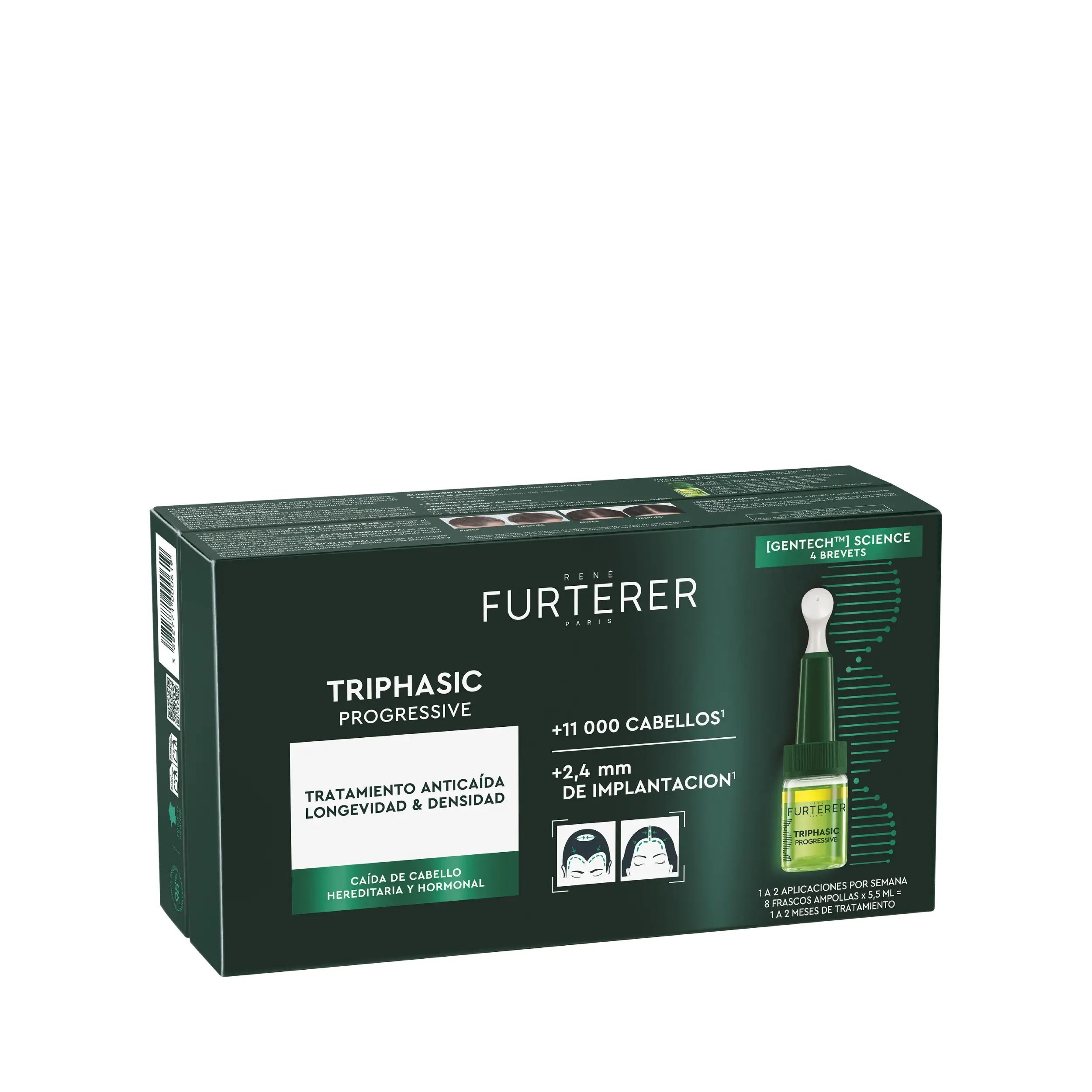 René Furterer Triphasic Gen Tech Progressive Ampoules is a professional anti-hair loss treatment designed to target progressive, hormonal and hereditary hair loss. Developed after more than 10 years of advanced genetic research, this patented triple-phase formula acts on the three genetic markers responsible for hair cycle disruption.