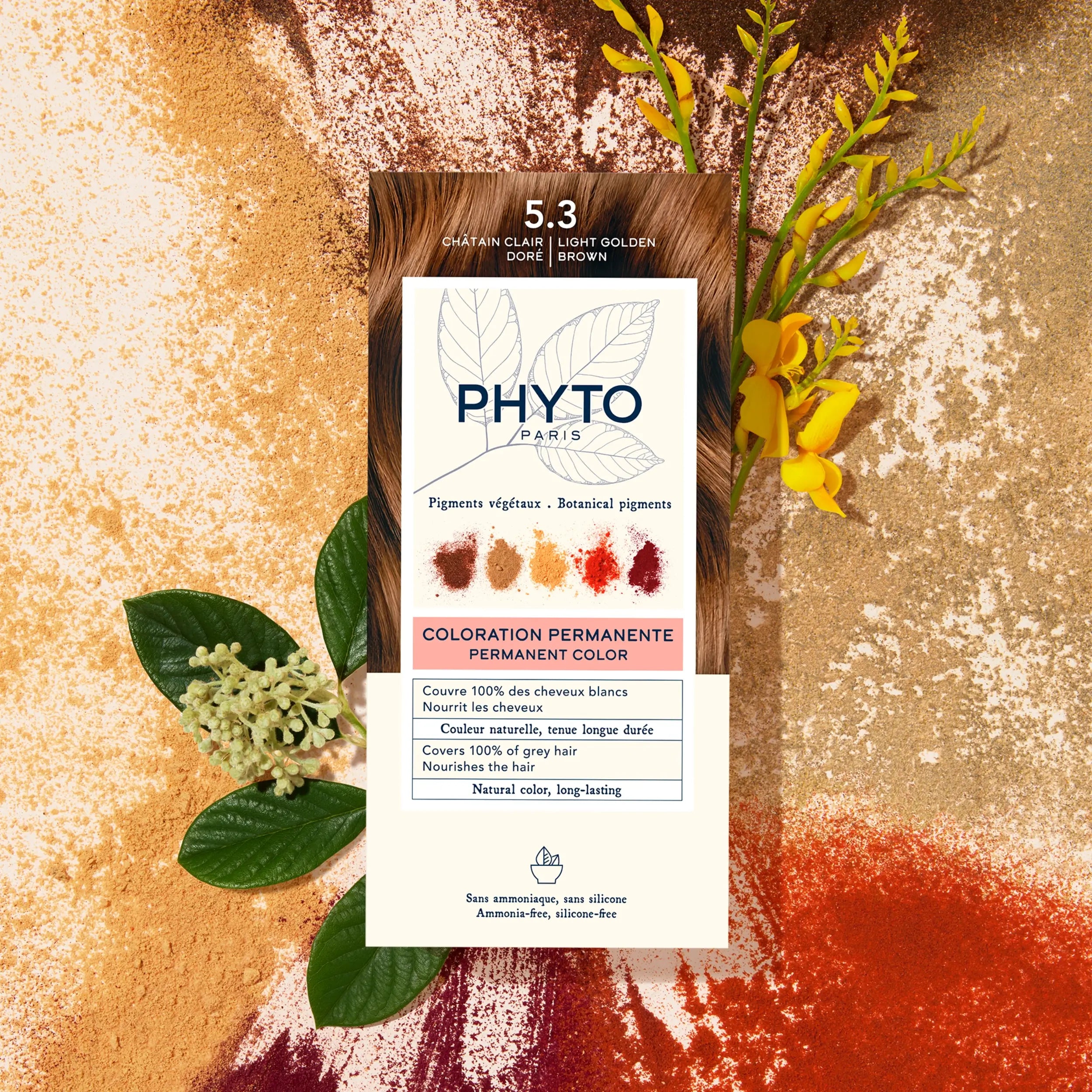 Phyto Permanent Hair Color 5.3 Light Golden Brown a natural and long lasting color with luminous reflections, covering 100% of white hair and respecting the scalp, are the principles of Phyto Color, a coloration of original tones exclusively formulated from vegetable pigments.