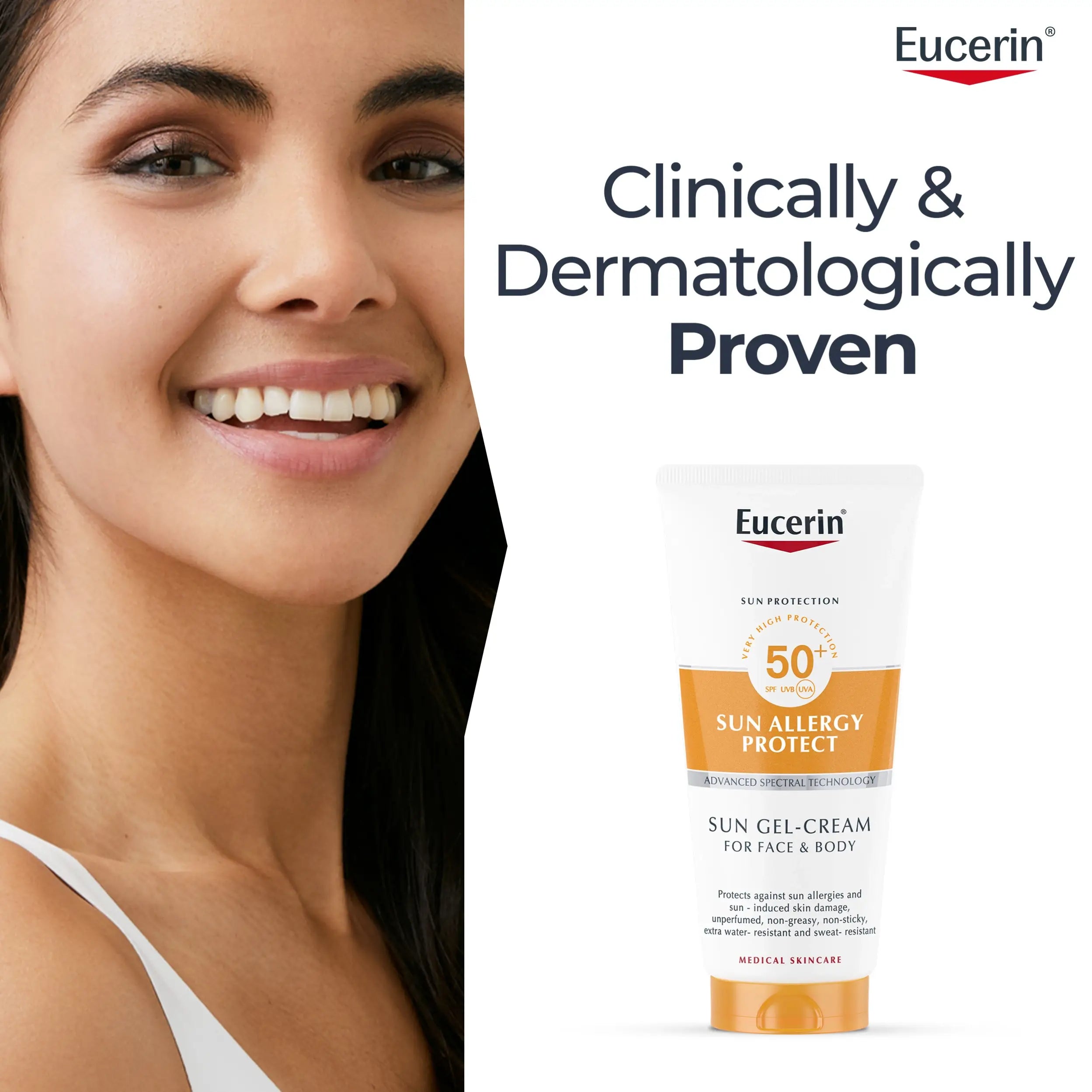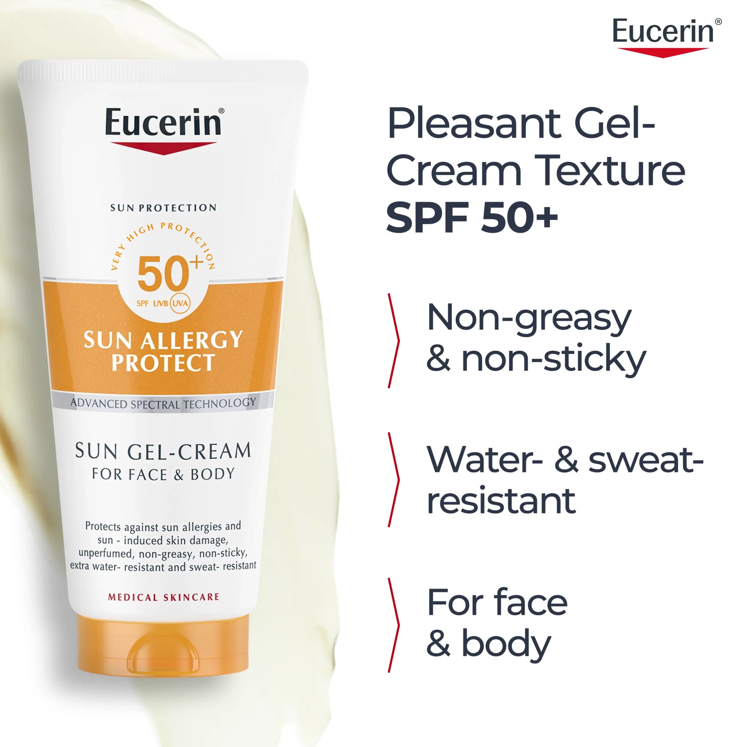 Eucerin Sun Allergy Protect Cream-Gel SPF50+ provides very high sun protection while helping to prevent sun-induced skin allergies on both face and body. Specially developed for very sensitive and sun-allergy-prone skin, this advanced gel-cream protects against sunburn, skin damage, and allergic reactions caused by UV exposure.