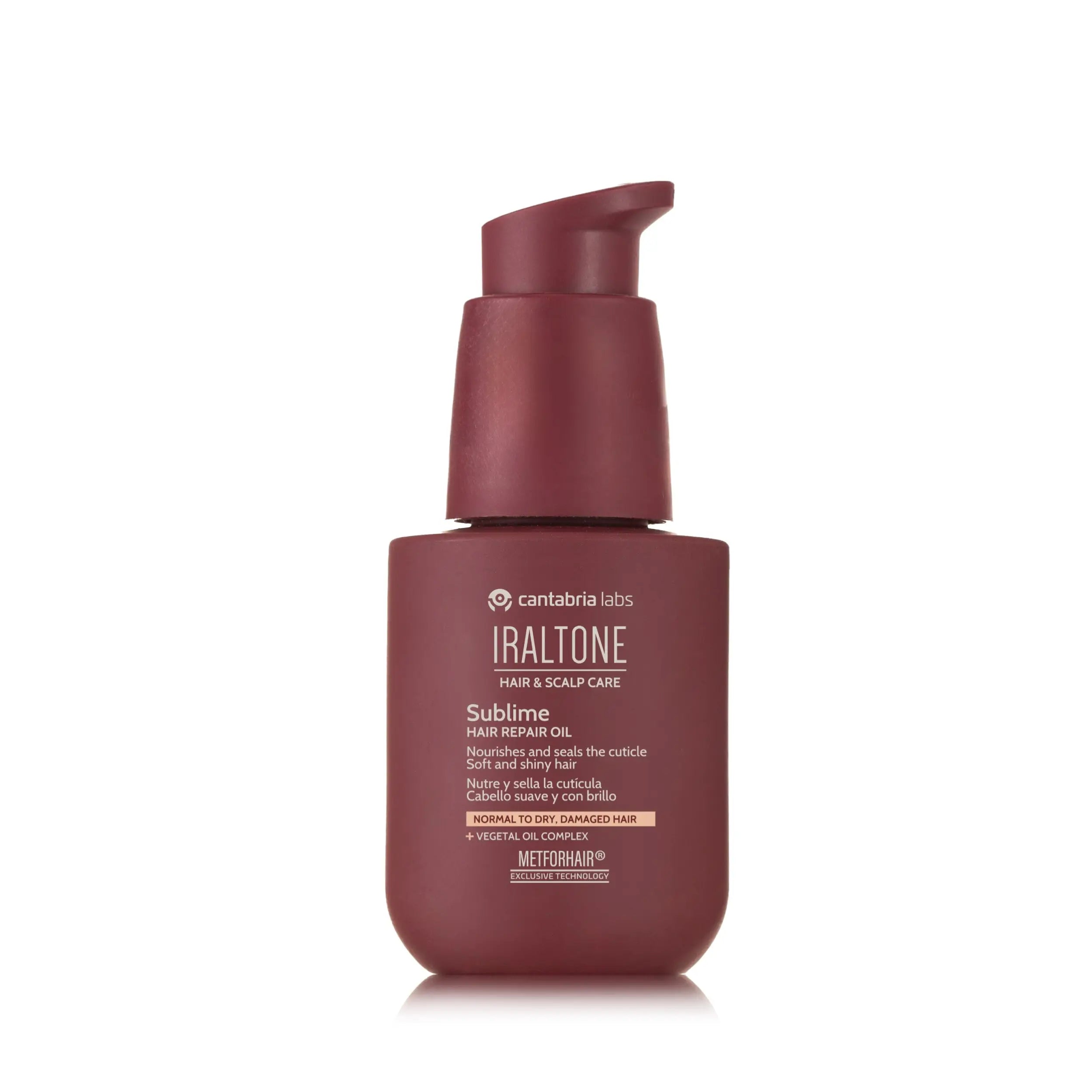 Iraltone Sublime Hair Repair Oil is a high-performance hair treatment designed for dry and damaged hair. This nourishing oil repairs the hair fiber, seals the cuticle, and restores a healthy shine, leaving hair visibly stronger, silky, and radiant. Enriched with a vegan oil complex and MetforHair® technology, it enhances hair resilience, reduces frizz, and protects against daily damage. Ideal for all hair types in need of deep repair and shine.