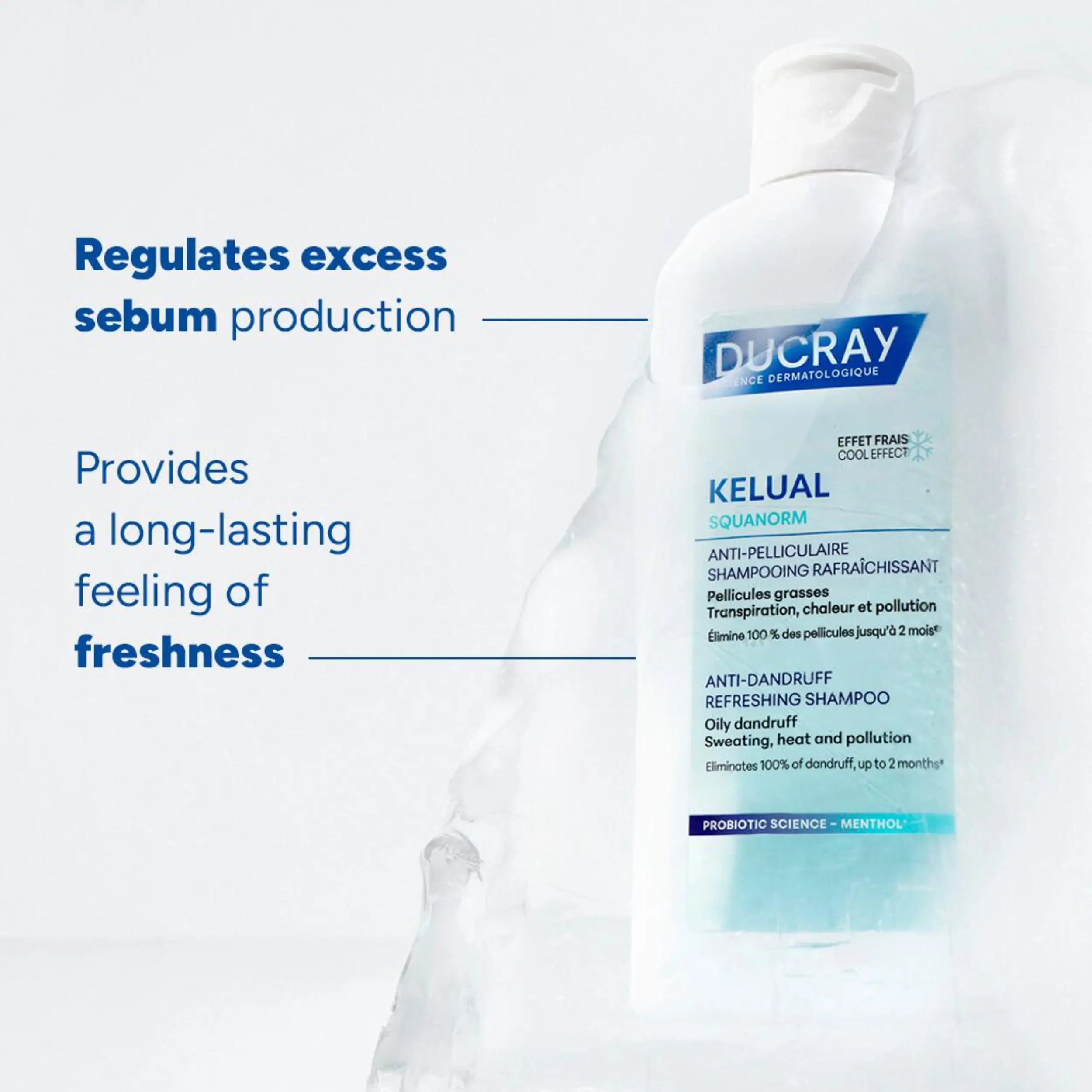 Ducray Kelual Squanorm Anti-Dandruff Refreshing Shampoo is a high-performance solution designed to eliminate oily dandruff aggravated by sweat, heat, and pollution. Inspired by probiotic science, this innovative formula purifies the scalp, regulates excess sebum, and delivers an intense cooling sensation for long-lasting comfort. From the first use, it removes visible dandruff and impurities while helping to prevent their recurrence. With a lightweight texture and refreshing action, it leaves the scalp revitalized, balanced, and deeply cleansed.